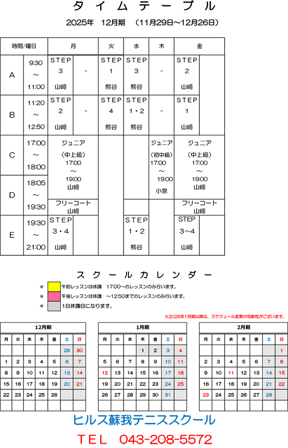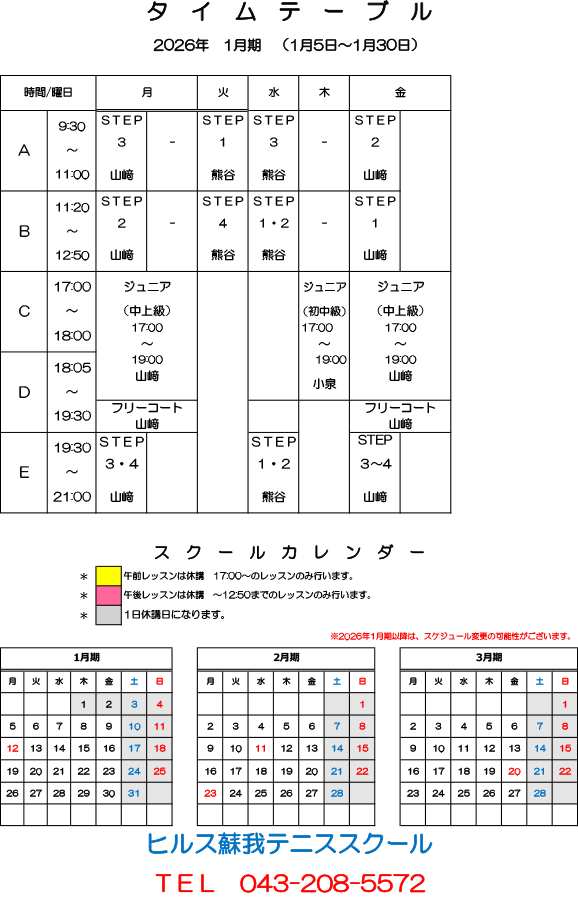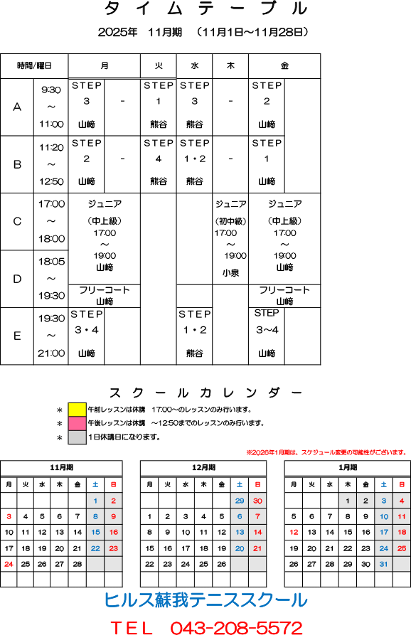 | 一般(硬式テニス) | 平日昼間 (12:50終了のレッスンまで) |