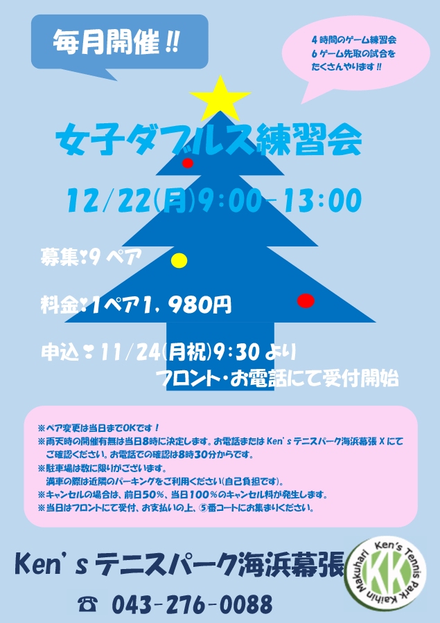 女子ダブルス・ゲーム練習会、12月22日(月)開催! — Ken’sテニススクールKen’sテニススクール