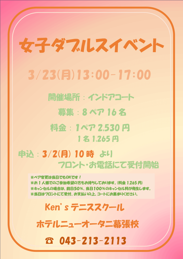 | 申込 | 3月2日(月)10時より 10:00よりフロントまたはお電話で受付 Ken’sテニススクールホテルニューオータニ幕張校 TEL:043-213-2113 |