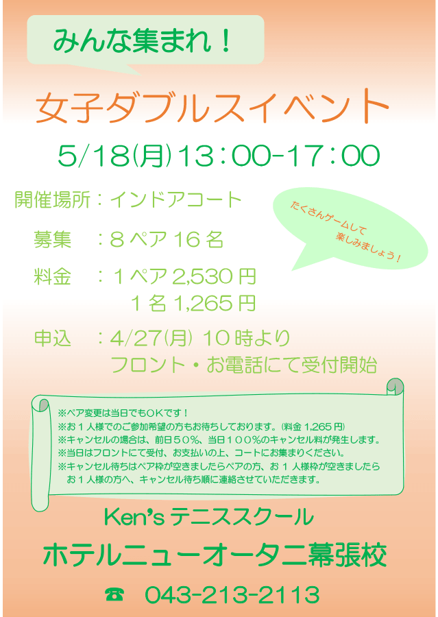 | 申込 | 4月27日(月)10時より 10:00よりフロントまたはお電話で受付 Ken’sテニススクールホテルニューオータニ幕張校 TEL:043-213-2113 |