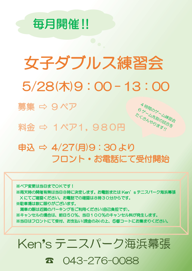 | 申込 | 4月27日(月)9:30より受付開始 9:30よりフロントまたはお電話で受付 Ken’sテニスパーク海浜幕張 TEL:043-276-0088 |