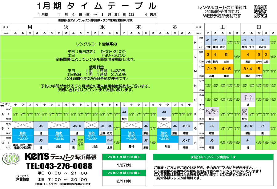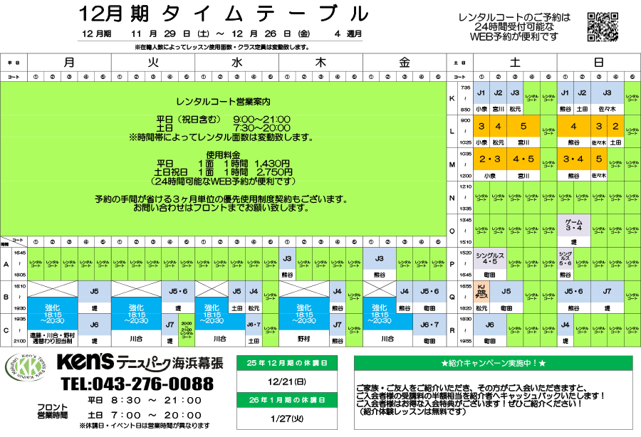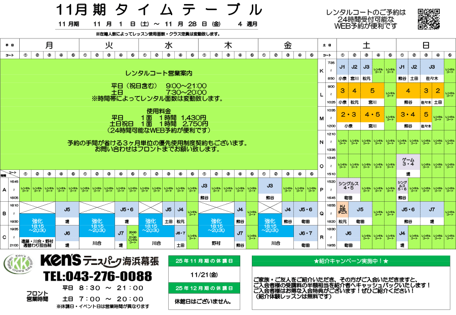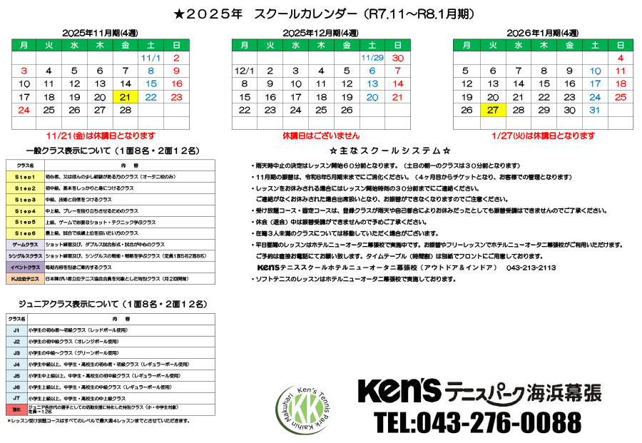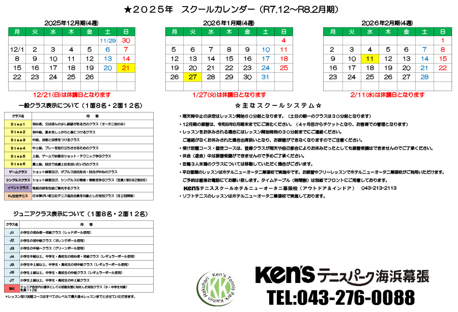 平日はジュニアのレッスン、大人向けのレッスンは土日のみ開催しています。Ken’sテニスパークホテルニューオータニ幕張校と合わせてご利用ください。