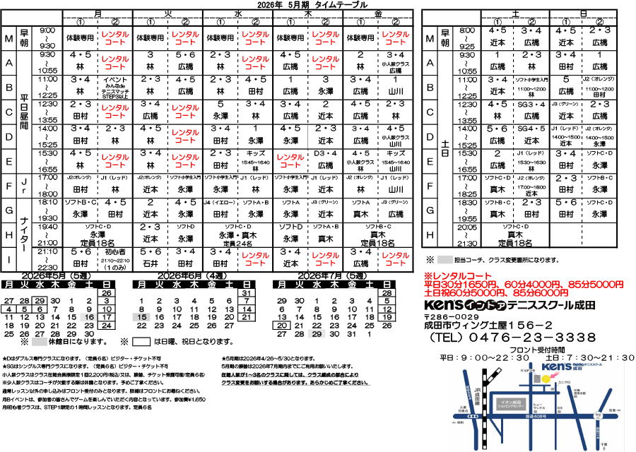 平日9:30〜22:30、土日8:00〜21:30の幅広い時間帯でレッスンが受講できます。成田校では2つのレベルのクラスの合同レッスンを行っています。